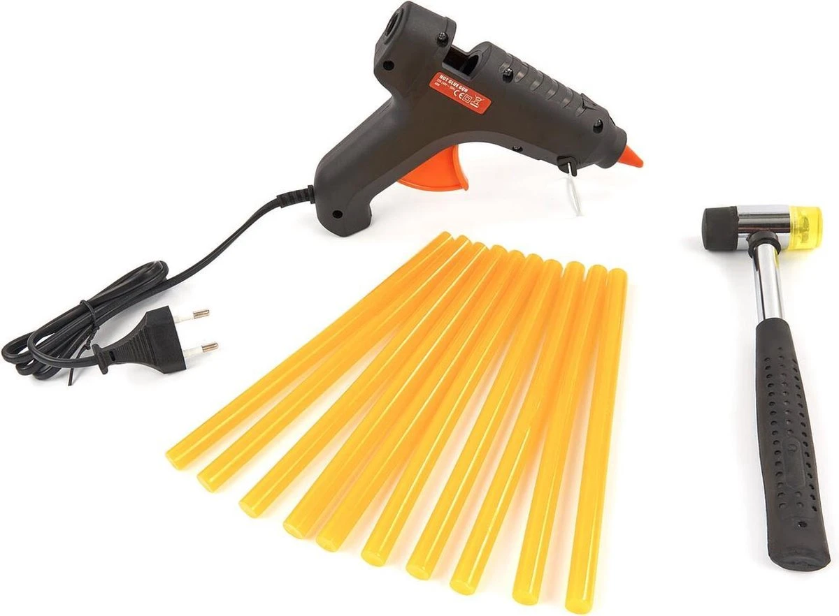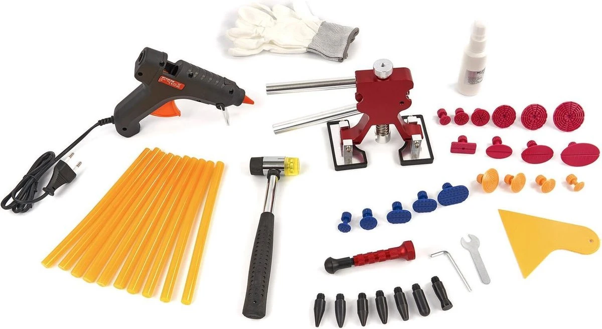 -Deze autogereedschapsset bevat alle nodige gereedschappen voor het verwijderen van deuken, zoals een paar handschoenen, lijmpistoolset en lijmtabset.