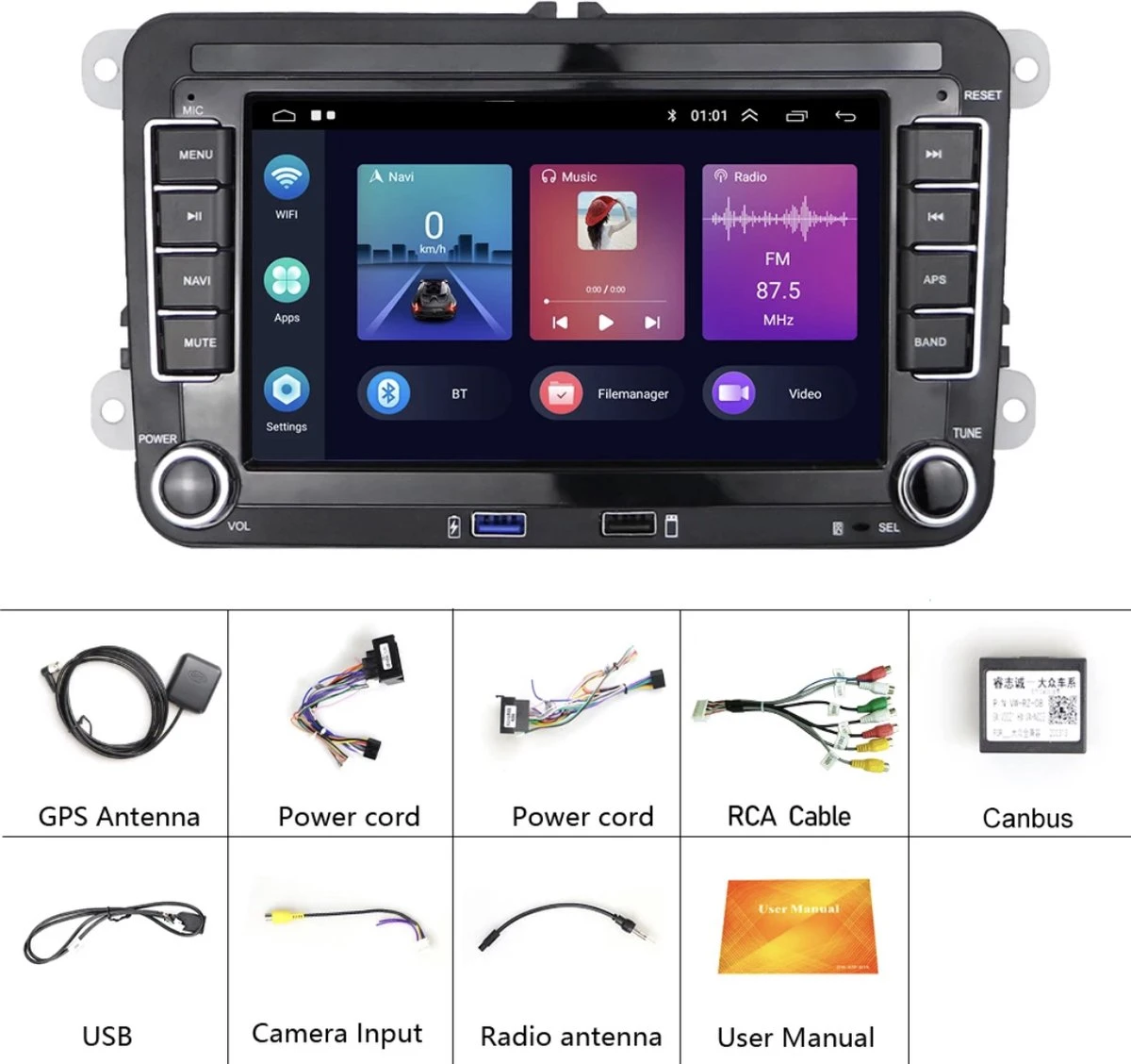 Ondersteunt stuurbediening en achteruitrijcamera met RCA-aansluiting. Ondersteunt Google Play en meerdere talen. Ondersteunt de spiegeling van link-verbindingen voor iPhone Airplay en Android-telefoon, Ondersteund DAB+ radio met antenne, Ondersteunt Bluetooth handsfree installatie. Hij is uitgerust met geïntegreerde WiFi, USB-poorten, aan-/uitkaart voor navigatie in de auto