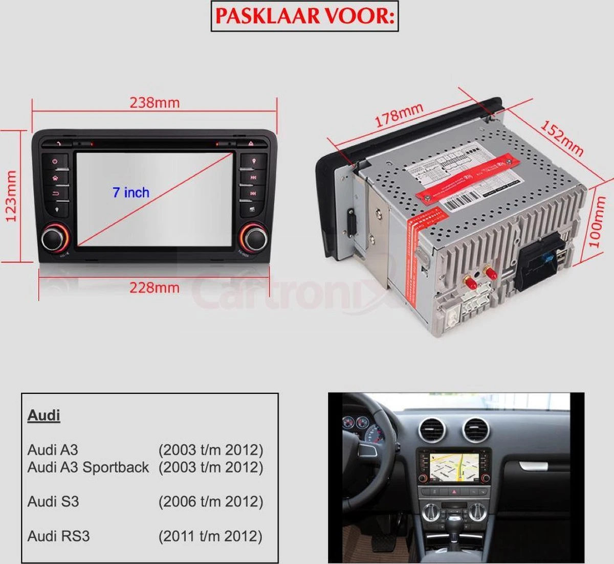 Hoewel dit apparaat geen Audi fabrieksradio is, is deze autoradio wel speciaal ontworpen door Cartronix dat deze gebruikt kan worden in de Audi A3, S3, RS3. Het is de perfecte vervanger voor de autoradio die in de fabriek standaard wordt geïnstalleerd. Het inbouwen van de Cartronix CTX-112747 is in de meest voorkomende gevallen eenvoudig.