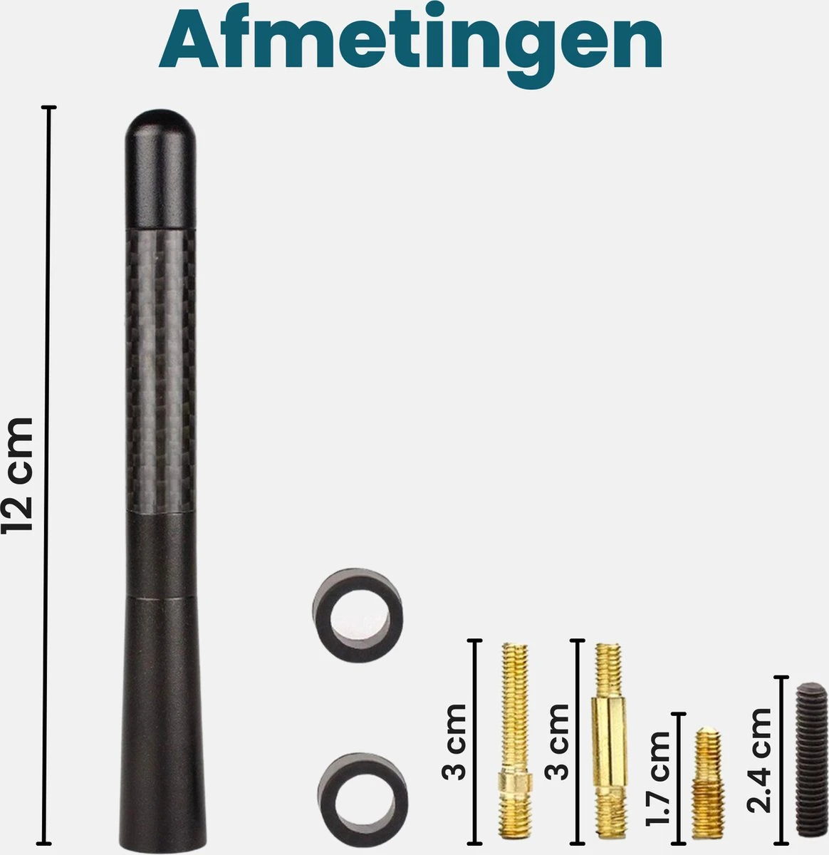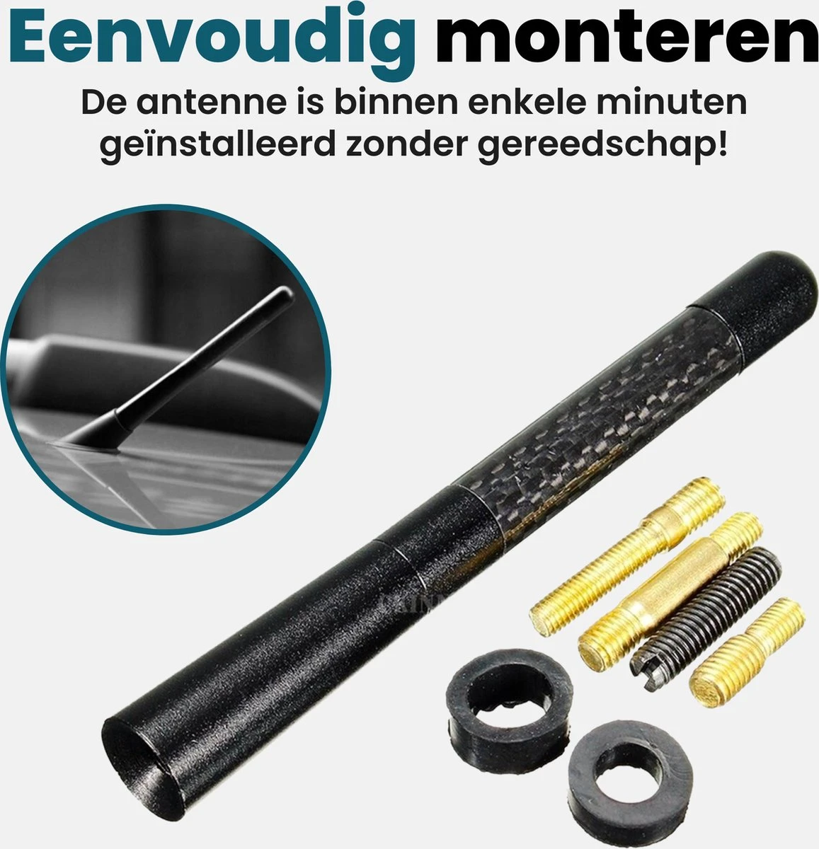 De auto antenne van Kirano is universeel toepasbaar op bijna alle auto’s. Er worden verschillende adapters bijgeleverd in verschillende maten. Kies een adapter die op jouw auto past, en monteer deze gemakkelijk tussen de auto en de antenne van Kirano.