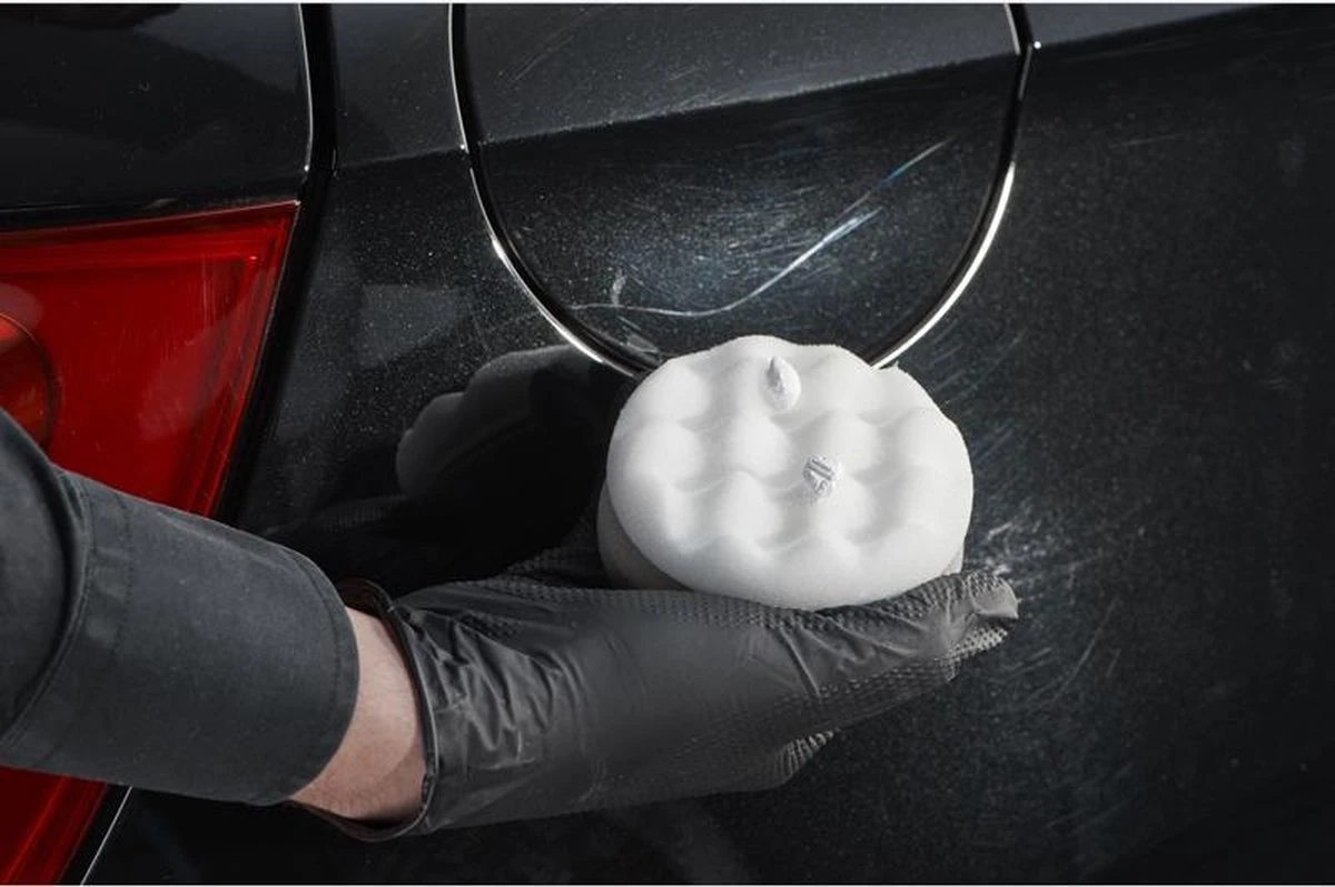 - Schud goed en breng twee hele kleine hoeveelheden Scratch Remover aan op de witte kant van de foam wafelapplicator