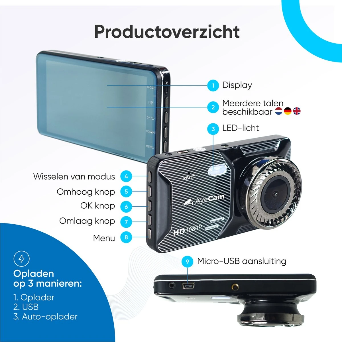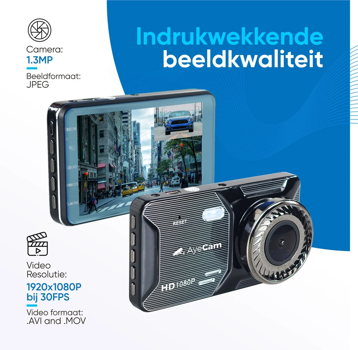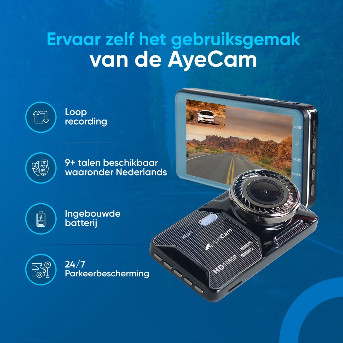 - Zeer gebruikersvriendelijk – De AyeCam Dashcam schakelt automatisch uit en aan. Hierdoor heb jij geen omkijken naar je camera en neemt hij direct alles op.