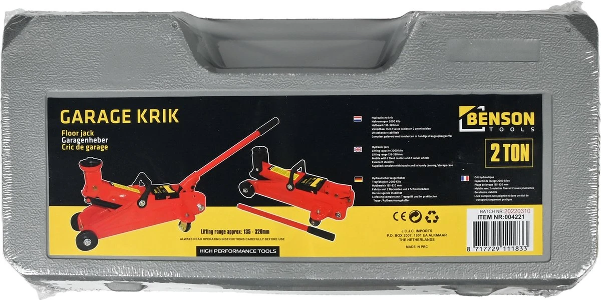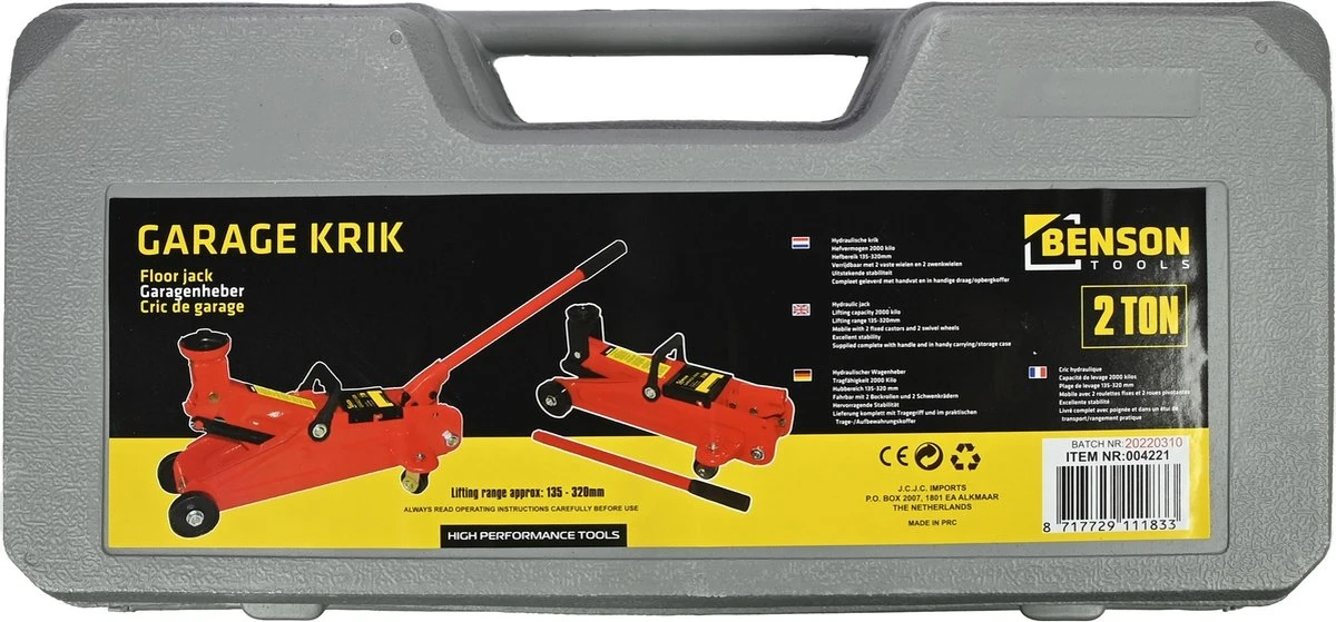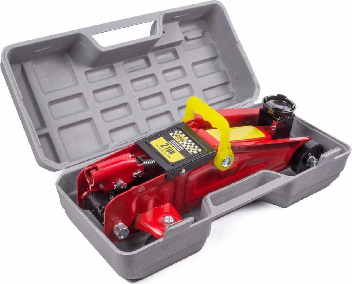 Garagekrik , Auto krik Deze robuuste stalen garage krik is zeer compact en heeft een afschroefbare pompstang waardoor u het makkelijk kan opbergen.Deze krik heeft een minimale hoogte van 125 mm ofwel 12,5 cm en een maximale hoogte van 300 mm ofwel 30 cm waardoor uw zeer makkelijk een wiel kan verwisselen van een voertuig. De krik is erg wendbaar en kunt u heel makkelijk verplaatsten door de twee zwenkwielen. De krik word geleverd met een kunststoffen koffer.