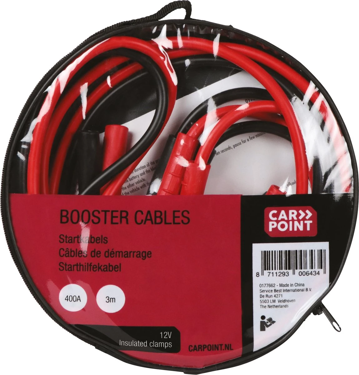 Deze Carpoint startkabels zijn de oplossing als de auto niet meer wil starten door een lege accu. Geschikt voor gebruik met 12 Volt accu’s. De startkabels zijn kleur gecodeerd (rood en zwart) en hebben een lengte van 3 meter. Maximaal belastbaar tot 400 Ampère, met volledig geïsoleerde klemmen.
