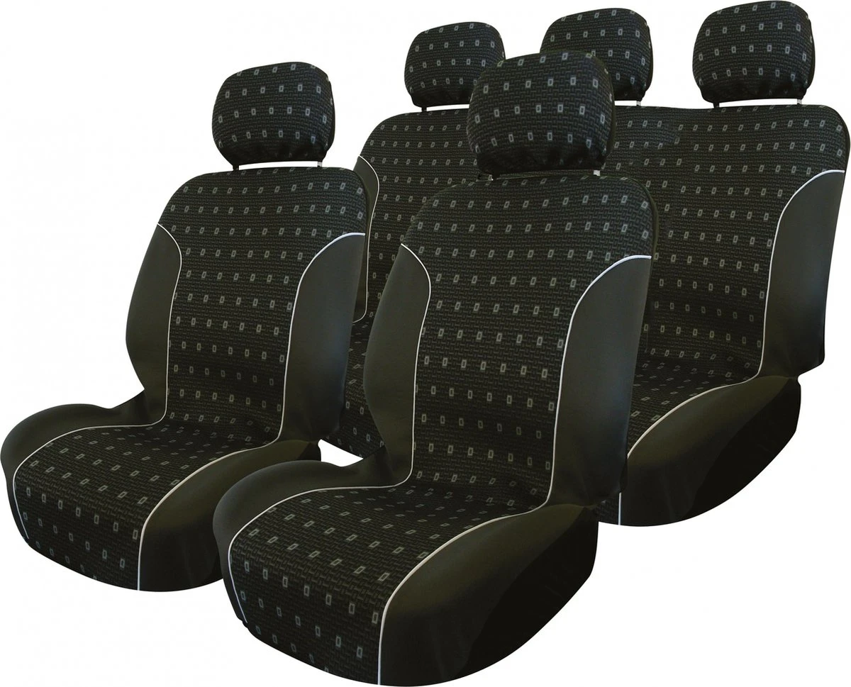 De Carpoint Charcoal pasvorm stoelhoesset is een complete universele 9-delige zwarte hoesset. De set bestaat uit twee voorstoelen, vijf hoofdsteunhoezen en een achterbank in twee delen (rugleuning en zitting). De hoes voor de achterbank is deelbaar door middel van 2 ritsen. Beschermt de originele bekleding tegen vuil en slijtage. Wasbaar op 30 graden. Geschikt voor auto’s met een zij-airbag.