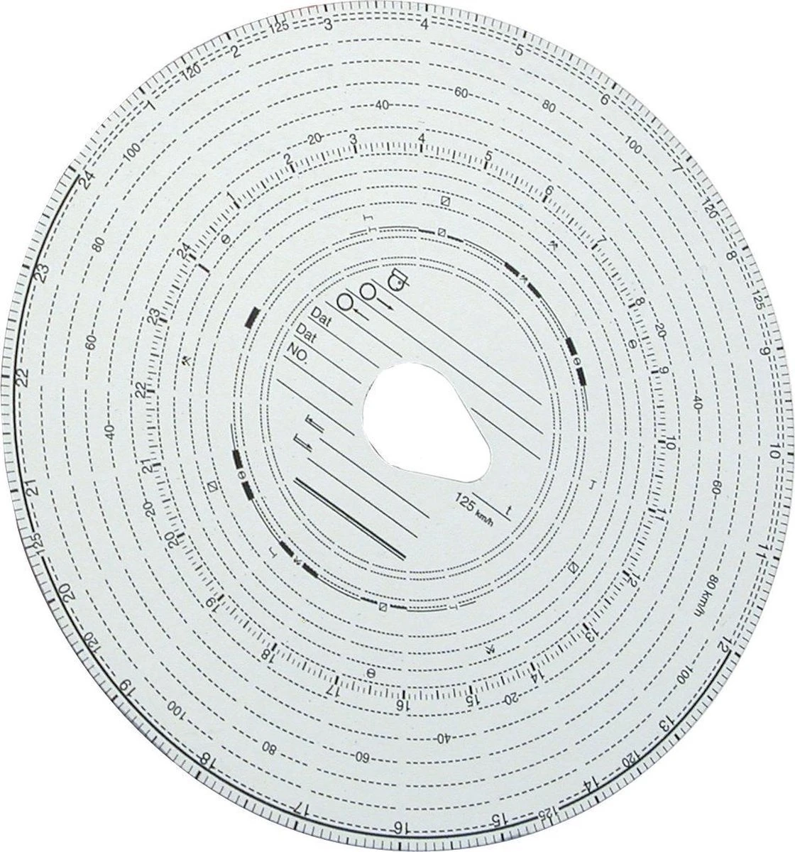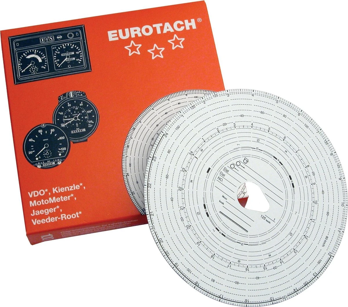 Een tachograafschijf wordt gebruikt om de rij- en rusttijden vast te leggen in het goederenvervoer. Deze schijf kan worden gebruikt voor 125 km en er zitten er 100 in de verpakking.
