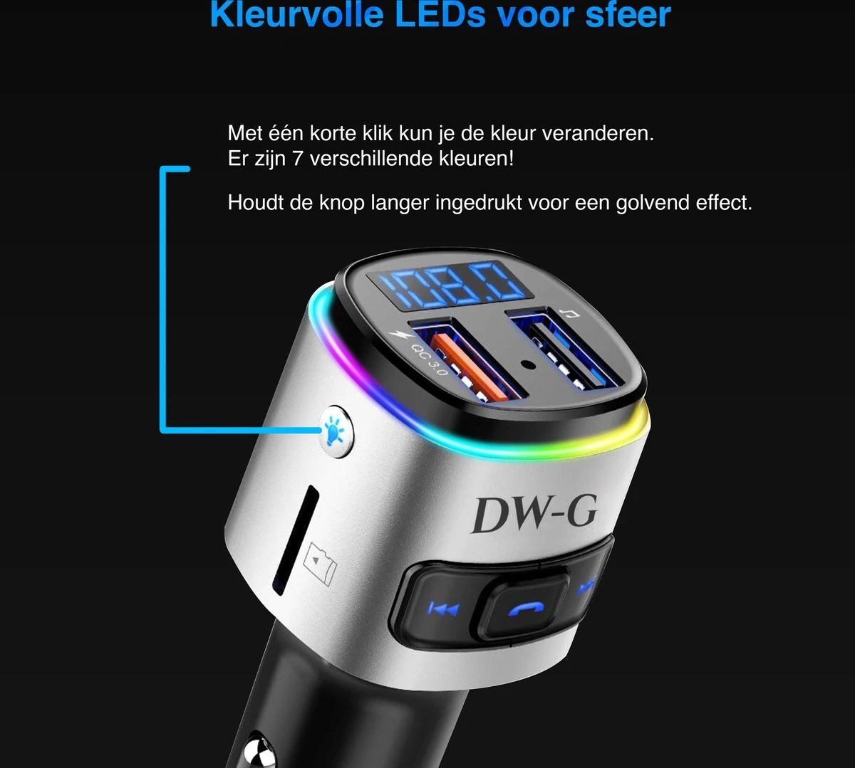 Verbind je smartphone draadloos en gemakkelijk met de FM Transmitter van DW-G. De FM transmitter/Carkit is een model vol met handige en vernieuwde opties.