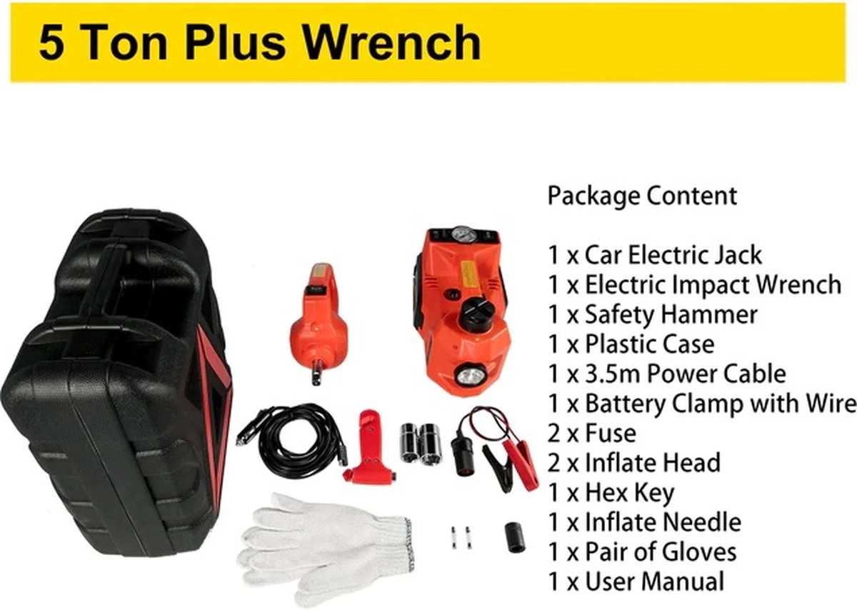 De kit bevat alles wat u nodig hebt om te beginnen, waaronder een elektrische autokrik, veiligheidshamer, accuklem met draad, zekering, opblaaskop, inbussleutel, opblaasnaald, handschoenen en handleiding.