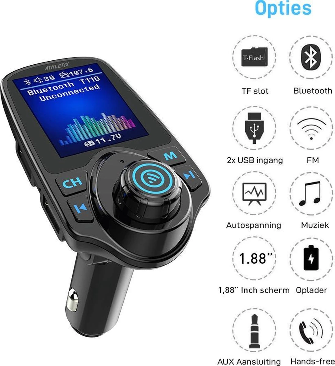 Met de Plug en Play FM-transmitter van Athletix T11 D-serie kan je binnen enkele secondes muziek beluisteren via je mobiel en hands-free bellen en dit allemaal draadloos je hebt alleen bluetooth nodig.