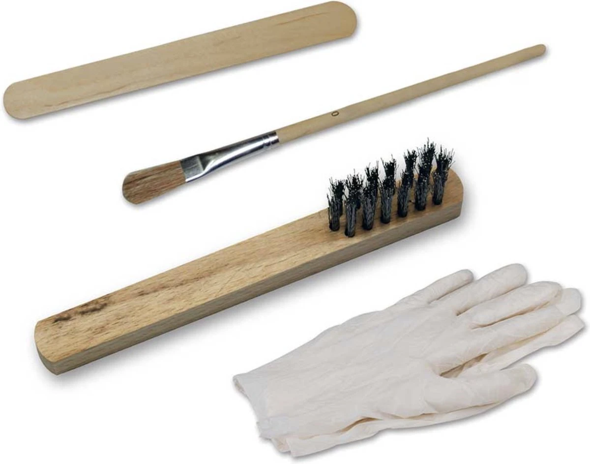1 staalborstel, 1 fijnhaarborstel, 1 spatel, 2 beschermende wegwerphandschoenen.