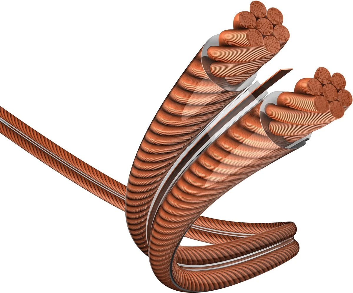 The Excellence speaker cables MSR use the legendary MSR®-technology (magnetic current reflector). The basis for this is the so-called proximity effect in which adjacent conductors cause an uneven distribution of the electric current. Basis of the patented MSR®-technology is a fine copper strip placed between the conductors which reduces the proximity effect of the two conductors.