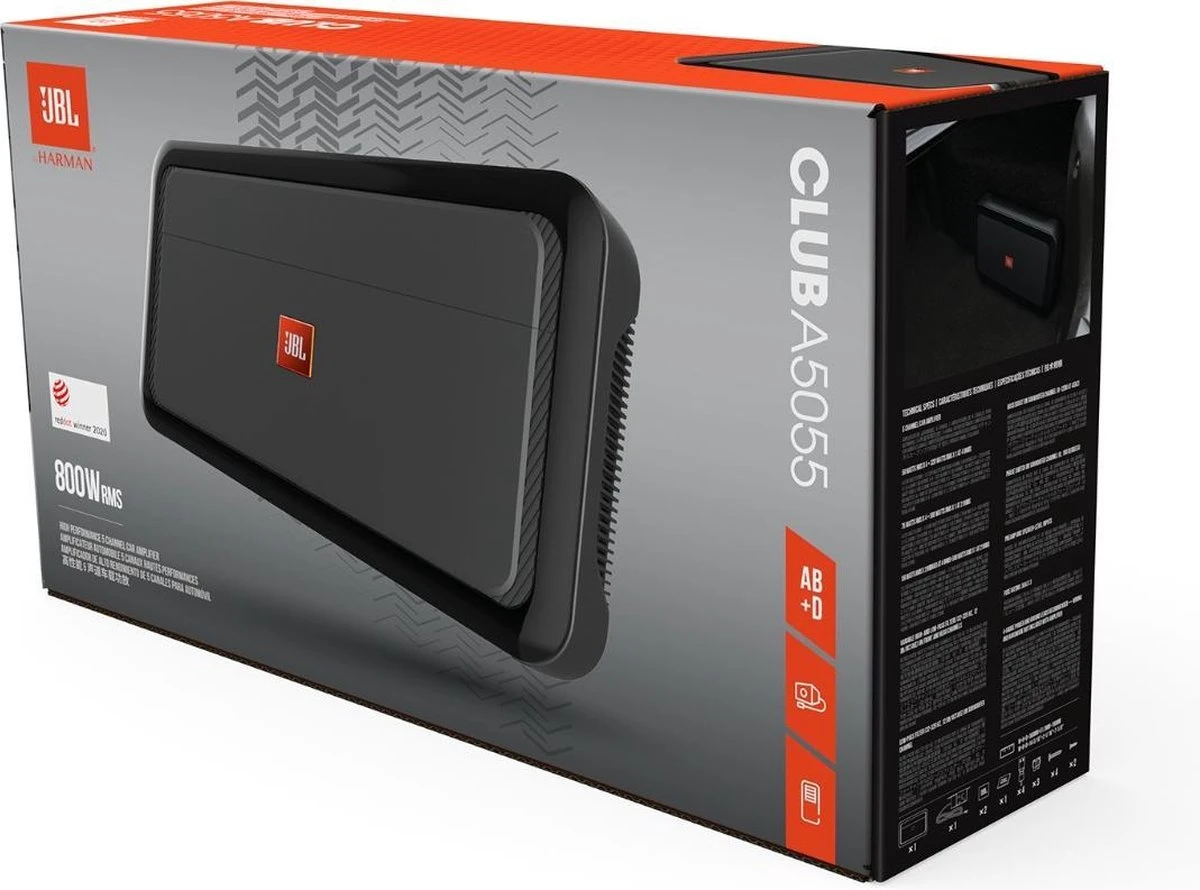 | Verpakkingsinhoud | One Club A5055 five channel amplifier 4 Bare wire-to-RCA adapters Six 30A ATO fuses (3 installed, 3 spare) Remote bass control module 16.5’ Remote control cable (RJ-25 plugs on both ends) 2 Self-tapping screws for remote (M3 x 15mm) 4 Mounting screws (M4 x 53mm) Owner’s Manual Two JBL stickers 1 logo badage |