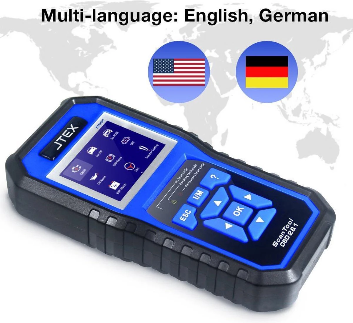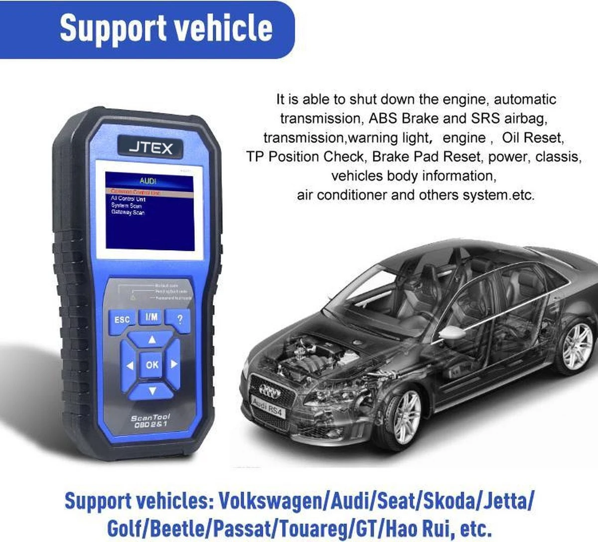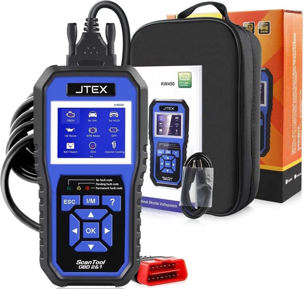 JTEX® KW450 VW Audi Seat Skoda Volledige systeemdiagnosescanner + OBDII EOBD-scanner Ondersteunt alle OBDII-compatibele voertuigen om technici in staat te stellen zelfs de moeilijkste problemen nauwkeurig te diagnostiseren. Verfijnd en toch gebruiksvriendelijk, deze ergonomische scannertool maakt de service-ervaring van uw voertuigen veel aangenamer!