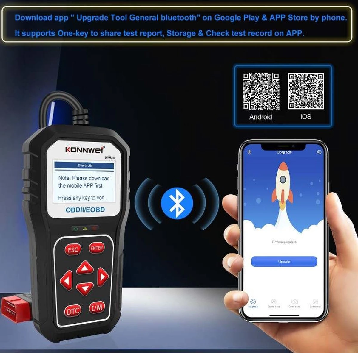 Deze OBD2 scanner kan je verbinden met je telefoon indien het over bluetooth beschikt. Daarnaast kan je via de ‘’Upgrade Tool General’’ app je OBD2 scanner updaten, test resultaten bekijken en storingen wissen en bekijken.