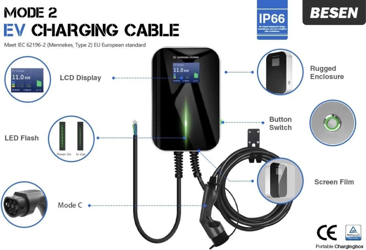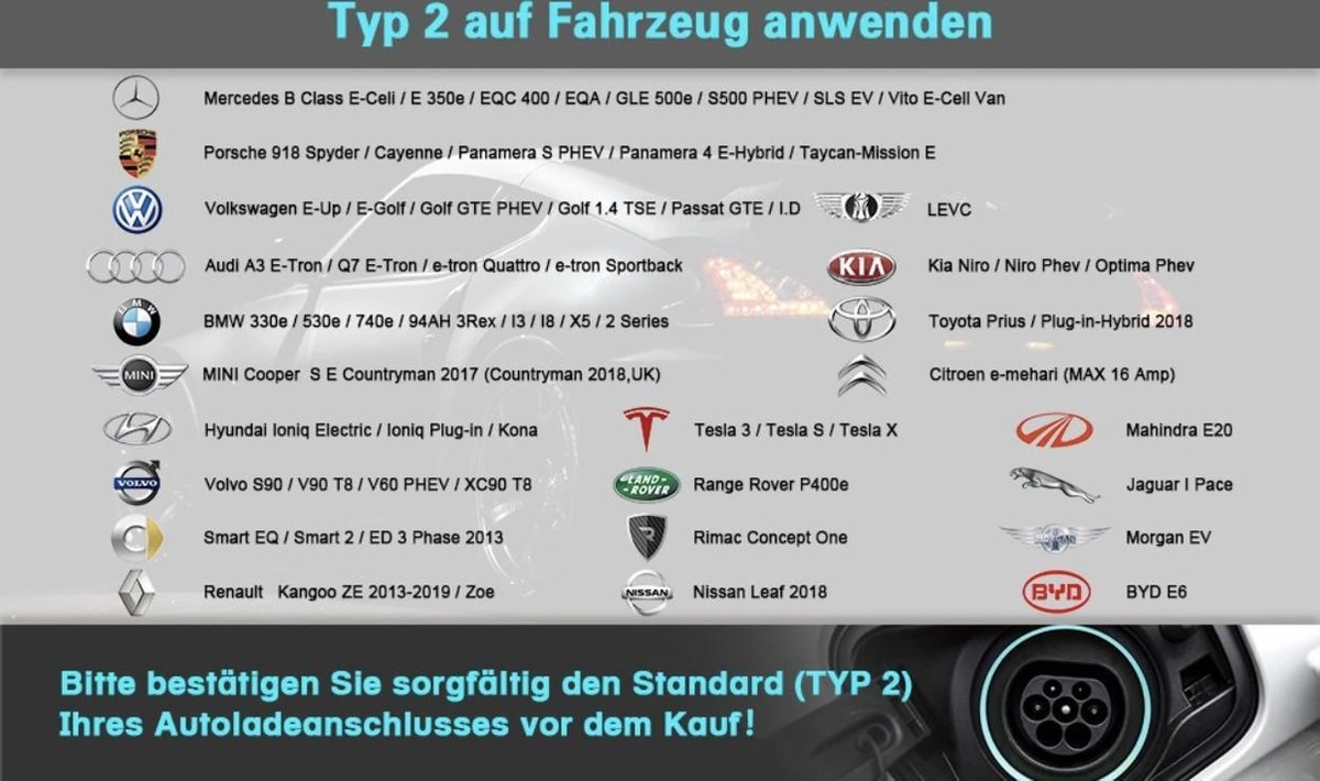 [Compatibiliteit en compatibiliteit]In tegenstelling tot normale EV-laders is onze EV-lader compatibel met alle elektrische auto’s die voldoen aan de IEC 62196-2-norm, inclusief Renault en Fiat. Al onze producten zijn CE-gecertificeerd en TÜV-gecertificeerd.