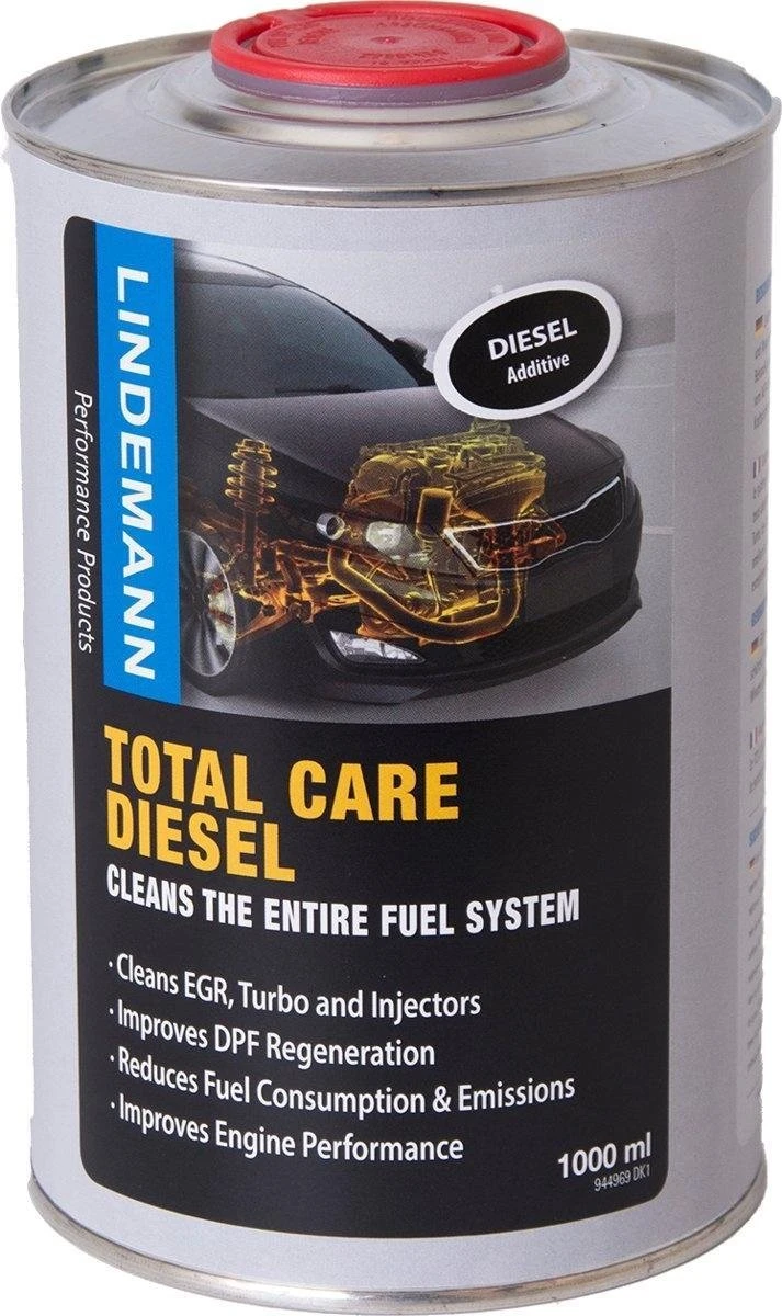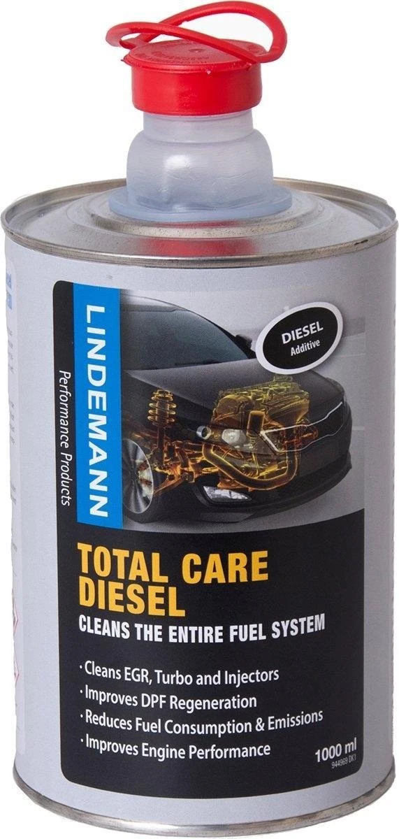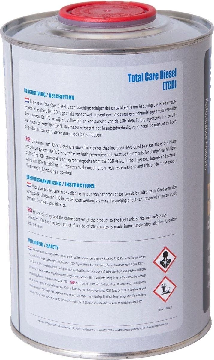 Lindemann Total Care Diesel is een krachtige reiniger dat ontwikkeld is om het complete in-en uitlaatsysteem te reinigen. De Total Care Diesel is geschikt voor preventieve- en curatieve behandelingen voor vervuilde dieselmotoren. Tegenwoordig hebben dieselmotoren steeds meer last van inwendige motorvervuiling. De Lindemann TCD verwijdert hardnekkige vuilresten en koolaanslag van de EGR klep, Turbo, Injectoren, Leidingen, In- en Uitlaatkleppen en Roetfilter (DPF). Bovendien heeft dit product sterke smerende eigenschappen!