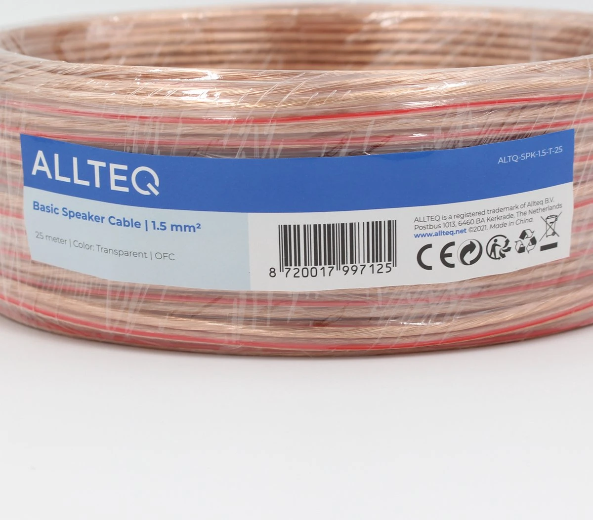 Deze Allteq luidsprekerkabel van 25 meter lengte staat garant voor een uitstekend geluid. De geleider van OFC koper zorgt voor een kristalheldere overdracht van de geluidssignalen. De transparante mantel is aan één zijde voorzien van een polariteitsmarkering. Hoe dikker een kabel, hoe lager de weerstand in ohm. Deze eigenschap wordt belangrijk wanneer je een lange speakerkabel van enkele meters in lengte gebruikt. Kies daarom een kabel met de juiste lengte en aderdoorsnede.