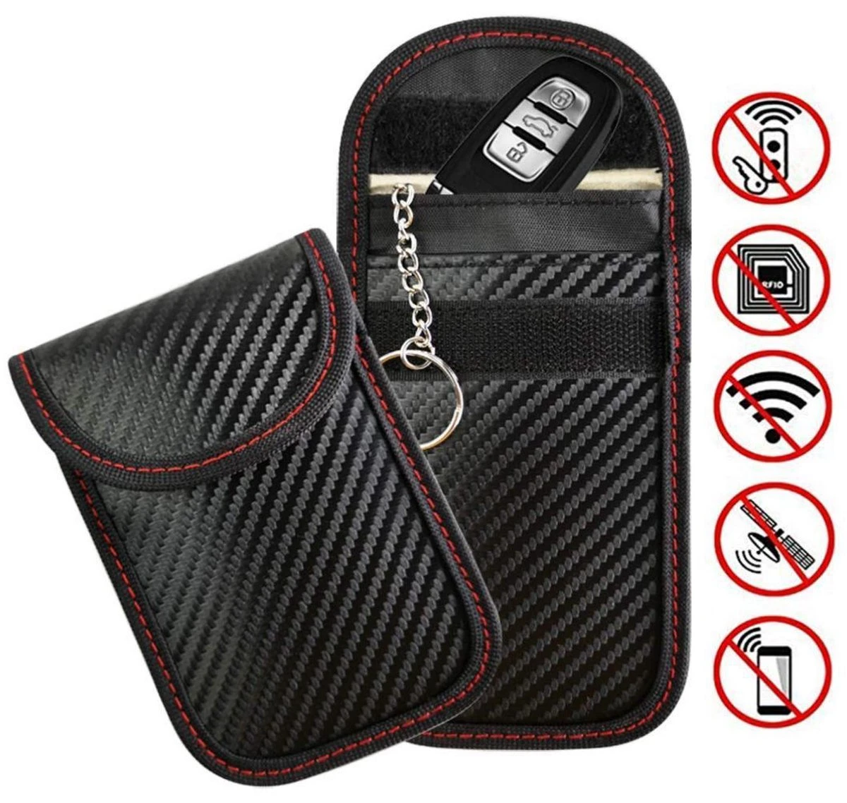 Onze beschermhoes heeft een binnenvak met een speciale nanolaag die voor de signaalblokkering zorgt. Het buitenvakje kan gebruik worden als een normaal vakje voor bijvoorbeeld bankpassen, creditcard, ID, enz. designed with a keychain which makes it easy to carry.