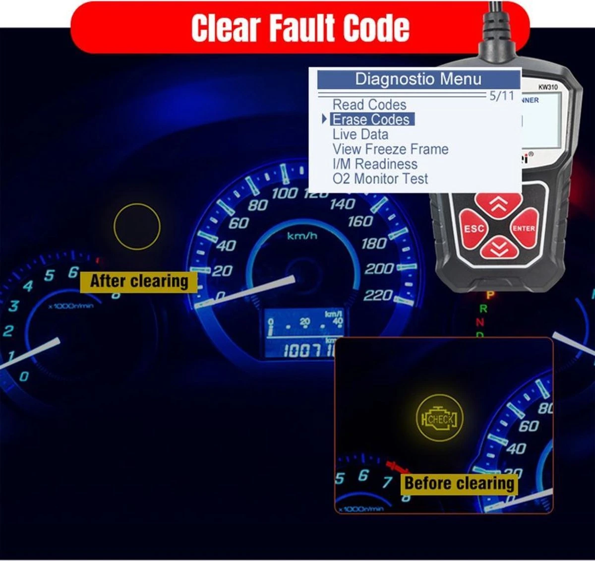 2. wissen Codes & Reset schakelt, Motor Controleren licht (MIL), wist codes en reset monitoren.