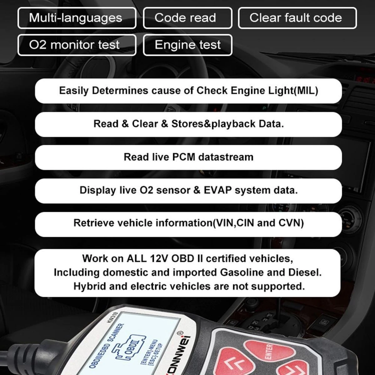 Hoewel het compatibel is met de meeste auto’s, maar verschillende regio’s ondersteuning van het voertuig OBD2 protocol op verschillende tijden, of sommige auto hebben een speciaal ontwerp, dus kan het zijn dat deze niet compatibel is met sommige auto’s zonder OBD2 protocol. Vooral Japanse en Koreaanse automerken. En dit apparaat heeft alleen OBD2 Functies, geen Functies, Zoals ABS Reset, airbag Reset…