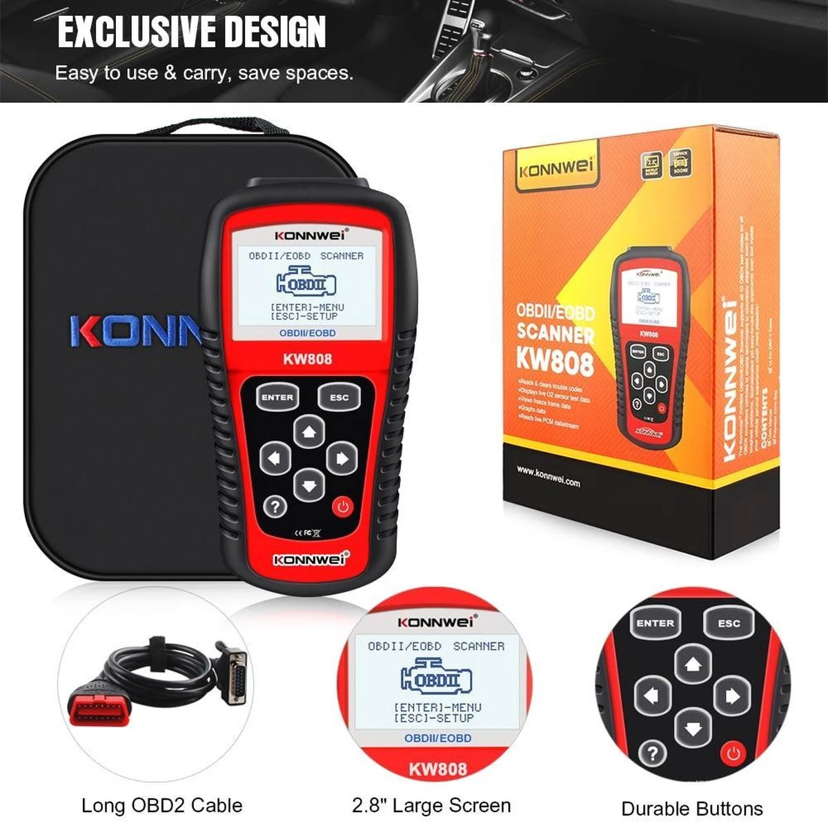De KONNWEI KW808 OBD II/EOBD Scanner ondersteunt alle 10 OBD II test modes op alle OBD II compliant voertuigen. Technici zijn in staat om nauwkeurig te diagnosticeren zelfs de moeilijkste problemen. Geavanceerde en toch eenvoudig te gebruiken, deze ergonomische scan tool maakt uw voertuig service-ervaring veel aangenamer!