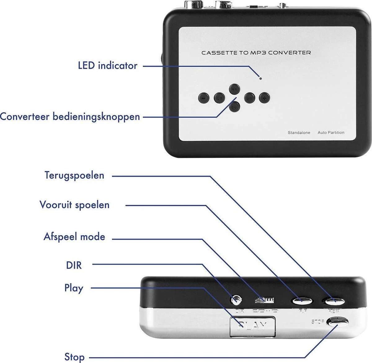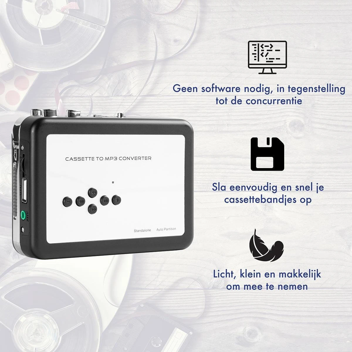 Wat de USB Cassette Converter zo bijzonder maakt, is dat er geen ingewikkelde software aan te pas komt. Iedereen kan er mee overweg en dit scheelt veel tijd en moeite. Hoe het werkt? Plaats een USB-stick (max 32 GB) in het apparaat en druk op de knop ‘opnemen’. Het apparaat zet nu alles automatisch op de USB-stick in MP3 formaat. Zo kun jij jouw opnames altijd terugluisteren op je computer, telefoon of je brandt ze op een CD.