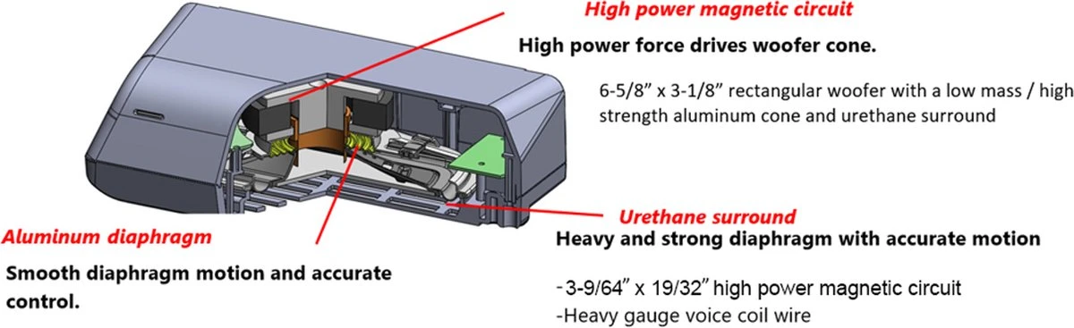 De TS-WX010A is voorzien van een rechthoekige woofer van 6-5/8″ bij 3-1/8″ met een conus van aluminium met een lage massa/hoge sterkte, een rand van urethaan en een krachtig magnetisch circuit, ondergebracht in een naar beneden gerichte afgedichte behuizing gemaakt van hoogwaardig kwaliteit hars. Deze compacte subwoofer wordt aangedreven door een ingebouwde klasse-D versterker met een vermogen van 50 watt RMS (maximaal 160 watt).
