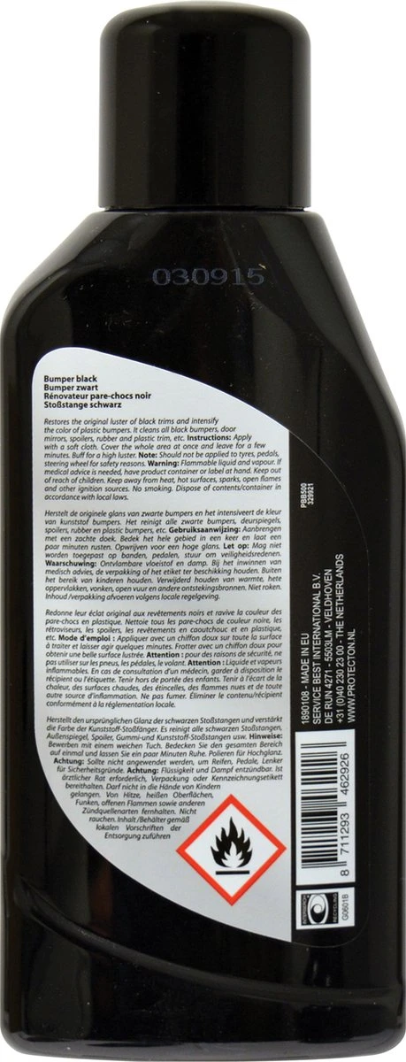 Bumper zwart intensiveert de kleur van zwarte kunststof bumpers, spoilers, deurspiegels en rubber. Geeft alle dof geworden zwart kunststof weer een mooie nieuwe glans. In handige flacon met een inhoud van 500ml.