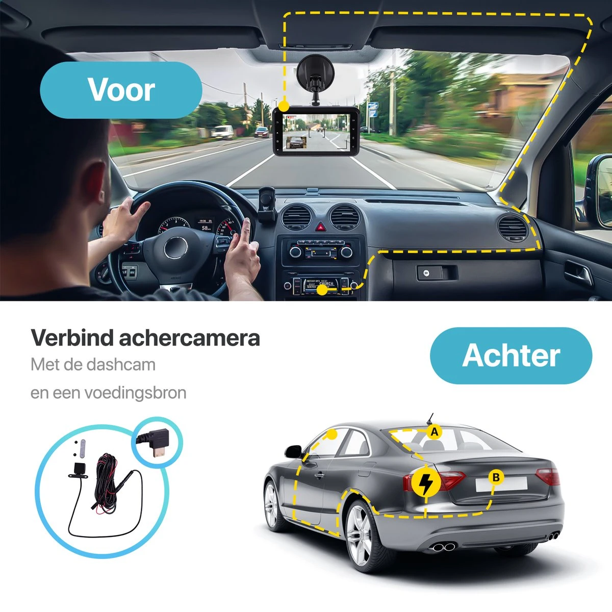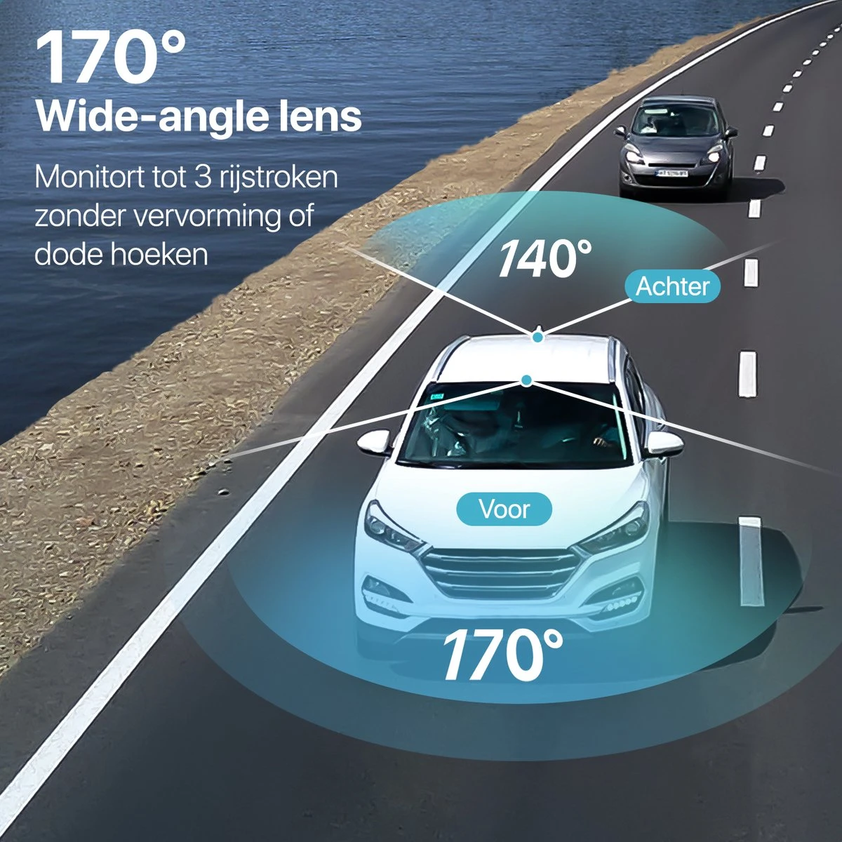 De dashcam kun je in een handomdraai op je voorruit monteren dankzij de krachtige zuignap. De achter camera is optioneel en dient op de achterruit of op de achterbumper van je auto bevestigd te worden. De achter camera is volledig waterdicht (IP68) en beide camera’s zijn uitgerust met nachtvisie. Zo maakt de dashcam zelfs tijdens een flinke regenbui of een donkere nacht scherpe beelden.