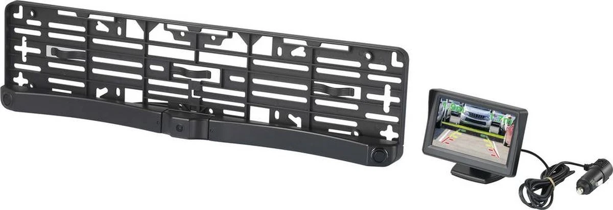 Slim inparkeren met overzicht Het Renkforce draadloze achteruitrijcamerasysteem voor Europese autokentekenplaten is een slimme hulp bij het inparkeren in lastige parkeerplaatsen. De montage is snel uitgevoerd: de kentekenplaat wordt eenvoudig in het cameraframe vastgeklikt, bedraad en weer op het voertuig gemonteerd. De meegeleverde monitor toont via een draadloze verbinding op het 10,9 cm grote display wat de camera opneemt. De voeding ervan loopt via een kabel voor de sigarettenaansteker. Naast de tot 90° verstelbare camerahoek beschikt het parkeerhulpsysteem over andere handige functies: onder andere geven de te monteren ultrasone sensoren op het display aan in welke richting het voertuig op dat moment stuurt en hoe groot de afstand tot het volgende obstakel is. En dankzij de zoemer is er zelfs een akoestisch signaal als het bijzonder krap wordt.