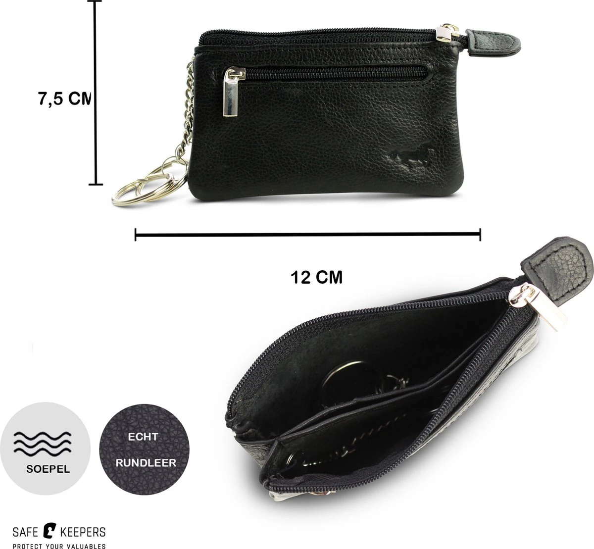 - Het sleuteltasje heeft 1 vakje aan de voorkant met rits, bijvoorbeeld voor muntgeld