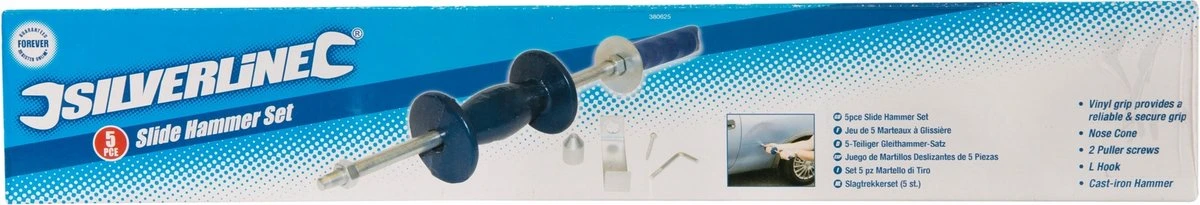 Sterke stalen schacht met vinyl grip. Voor het uitdeuken van autopanelen. Verwijdert moeilijk te verplaatsen lagers van assen en naven. Inclusief neuskegel, 2 × trekschroeven, l-haak en gietijzeren hamer. Lengte 460 mm.