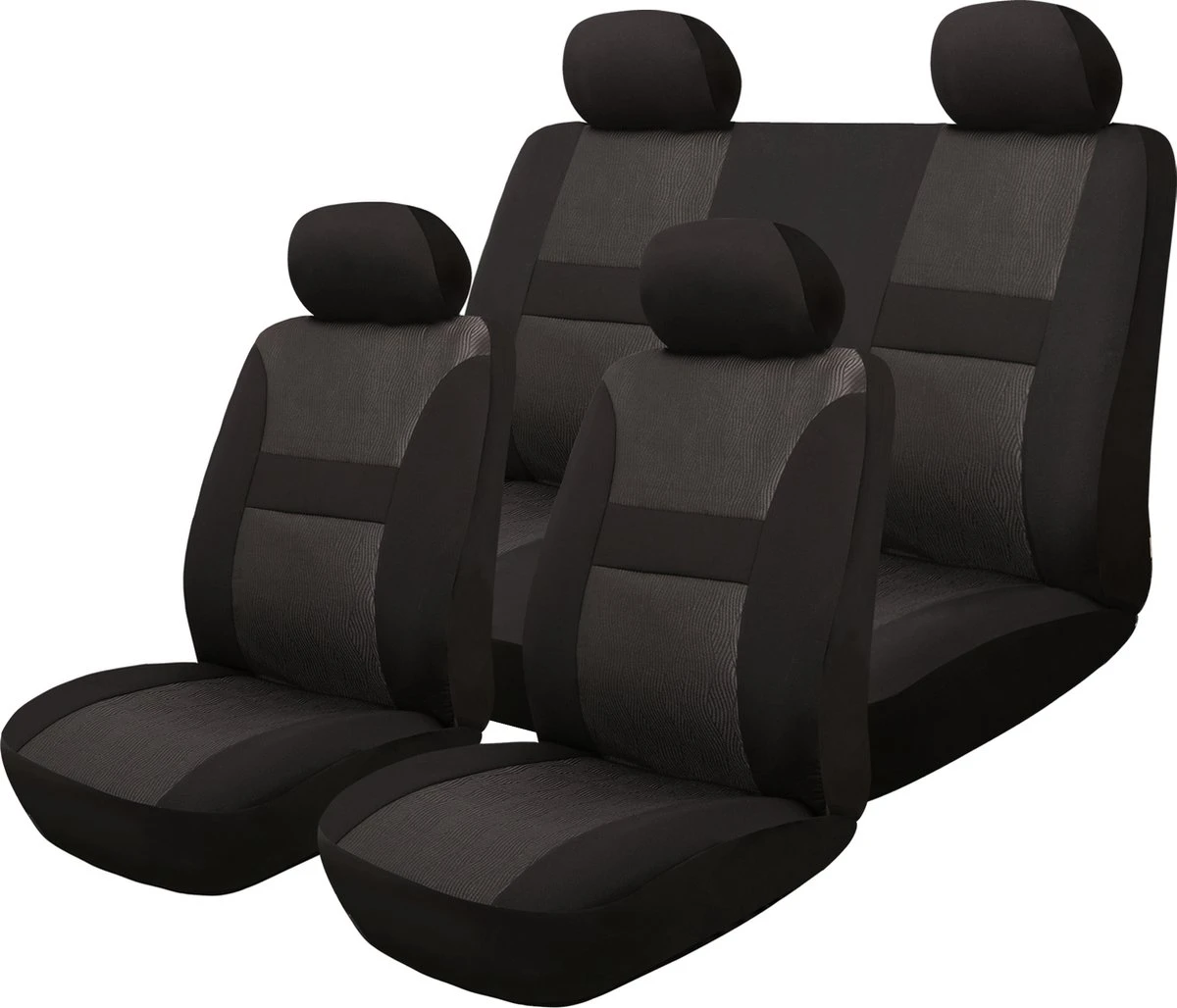 Eigenschappen: * Mooi design * Universeel * Gemaakt van Jacquard stof en gemakkelijk te reinigen * Geen verkleuring door UV-zonlicht Set bestaat uit: * 2 Hoezen zitting voorin * 2 Hoezen rugleuning voorin * 1 Hoes zitting achterin * 1 Hoes rugleuning achterin * 5 Hoezen voor kopsteunen Productdetails Kleur: zwart | grijs Bevestigingswijze(s) Elastiek Materiaal: Jacquard stof