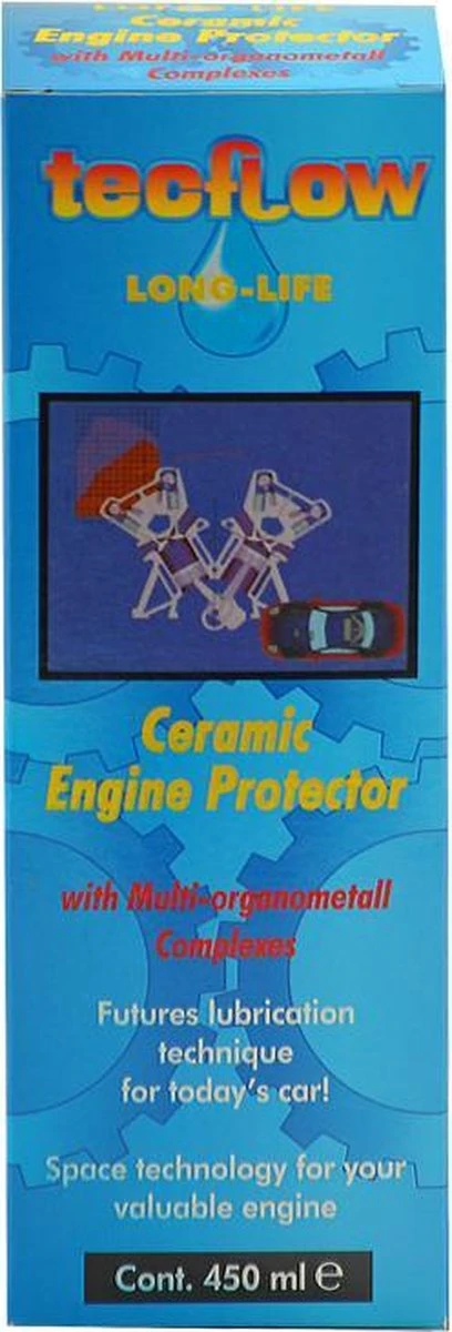 Tecflow Ceramic Engine Protector dient toegevoegd te worden aan de op bedrijfstemperatuur zijnde motorolie. De multi-organometaalcomplexen in combinatie met de keramische materialen hecht zich onmiddellijk aan de meest kritische (slijtage onderhevige) delen van de motor. Hierdoor ontstaat niet alleen een smeerfilm met “long-life” eigenschappen maar tevens een snelle warmteoverdracht. Daarnaast voorkomt Tecflow C.E.P verglazing van de cilinders met als gevolg een betere afdichting van de zuigers in de cilinders, een optimale verbranding, waardoor toename van het motorvermogen en afname van de uitstoot van schadelijke uitlaatgassen.