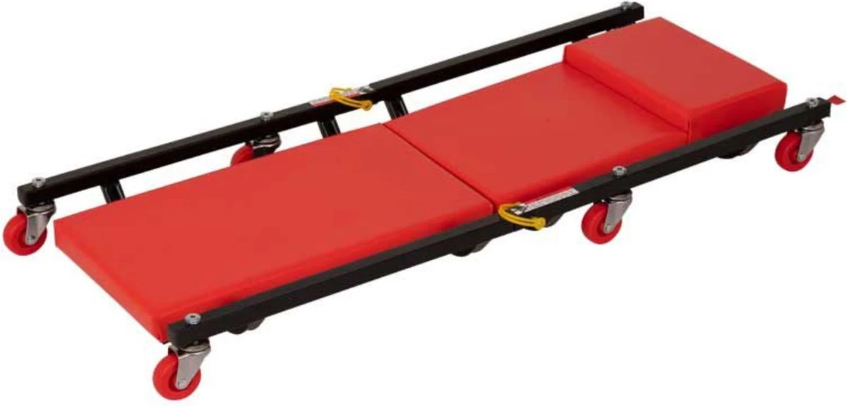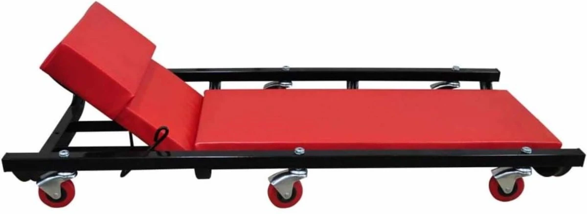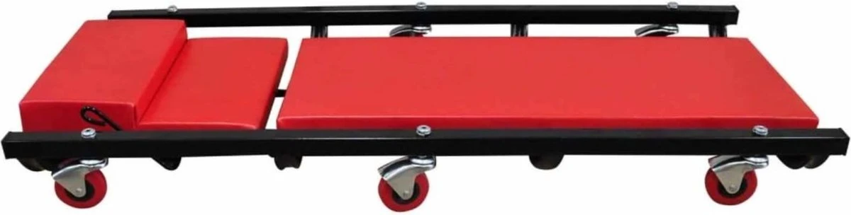 Mooie garageset bestaande uit ligkar met gepolsterd ligkussen en verhoogd hoofdeind op 6 stabiele zwenkwielen, garagekrik 2 ton met 2 zwenkwielen en 2 stabiele assteunen met een draagvermogen van 2 ton.