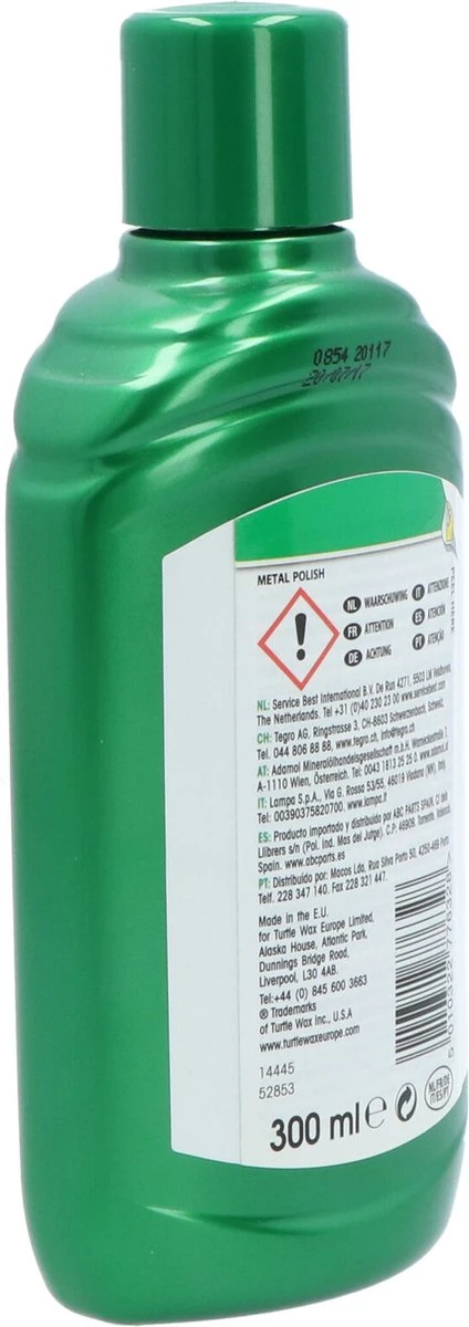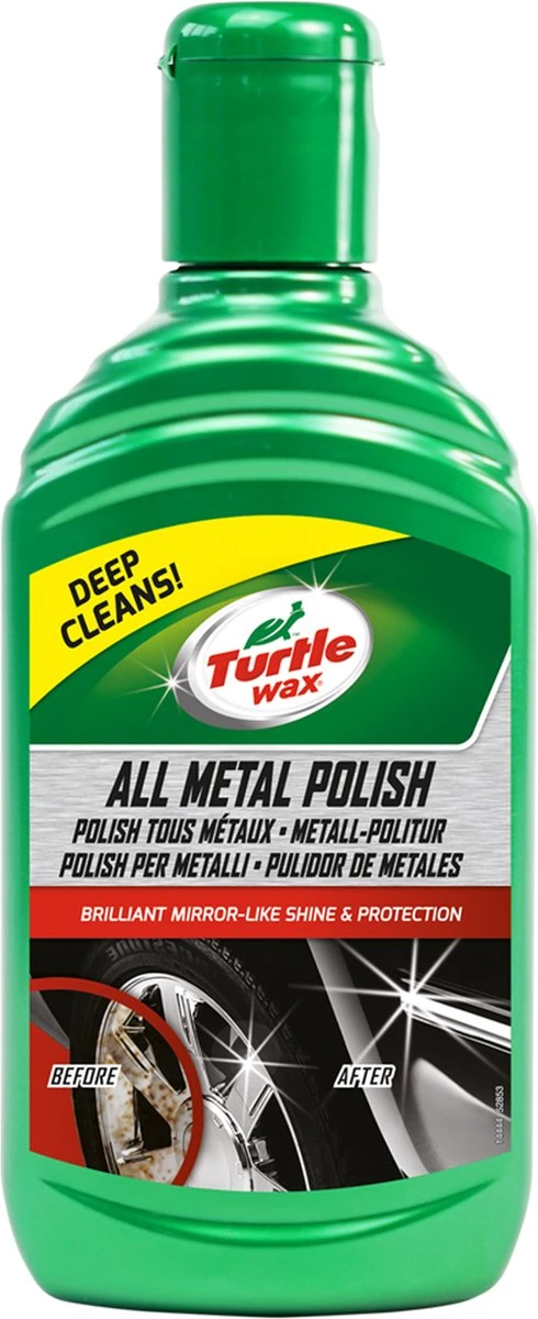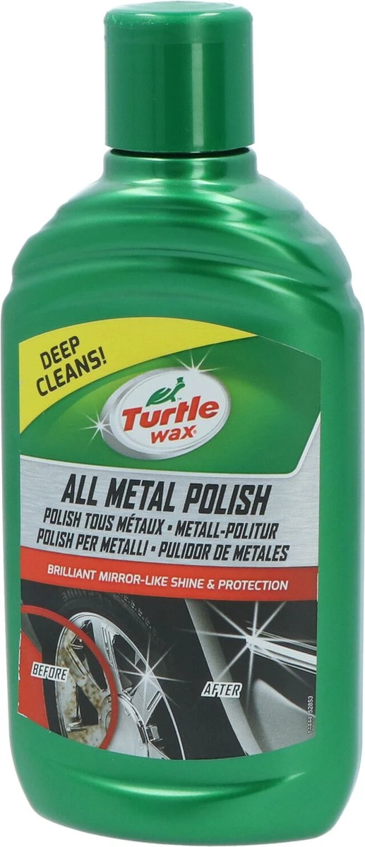 Turtle Wax GL All Metal Polish, de alles in één oplossing voor alle metalen oppervlakken. Herstelt metalen en chroomoppervlakken in hun showroomconditie. Lichtelijk schurende schoonmaak- en boenmiddelen verwijderen roest- en koolstofafzettingen, voor schitterende uitlaatpijpen en glanzende imperialen. Verwijdert oxidatie en vuil en brengt een beschermende laag aan. Vermijd rechtstreeks zonlicht en niet gebruiken indien oppervlakken heet aanvoelen. Op ernstig bevuilde oppervlakken kan een tweede behandeling nodig zijn.