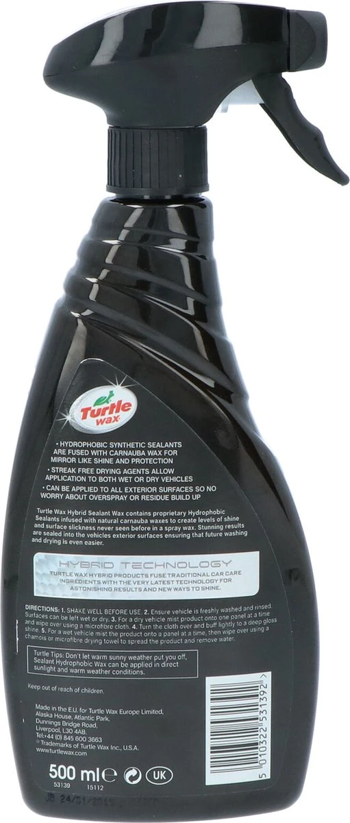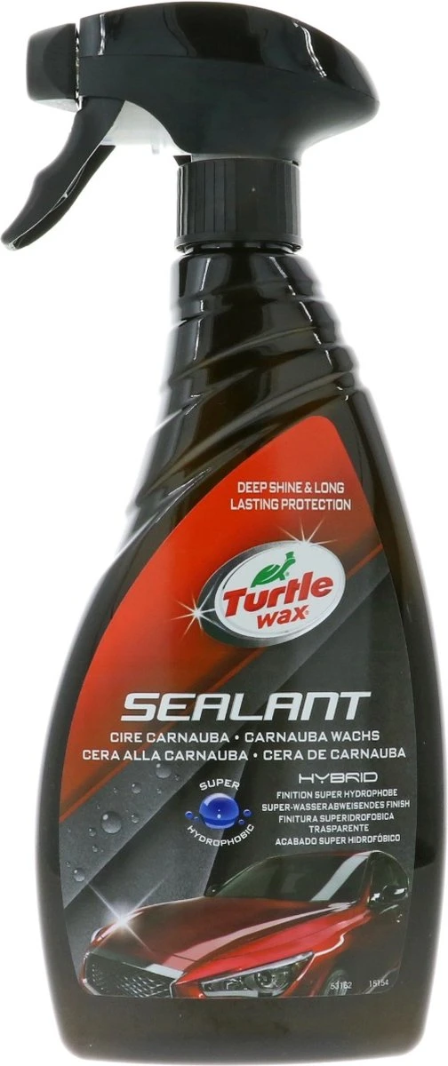Turtle Wax Sealant Hydrophobic Wax is de ultieme methode voor langdurige duurzaamheid en een super waterafstotend (water bollend) effect op het oppervlak van de auto. Dit eenvoudig te gebruiken product spuit u op en veegt u weg met een minimum aan inspanning. Het geeft een superieure glans en bescherming en zorgt voor een ongeëvenaarde waterafstotend effect die 6 maanden tot een jaar meegaat.