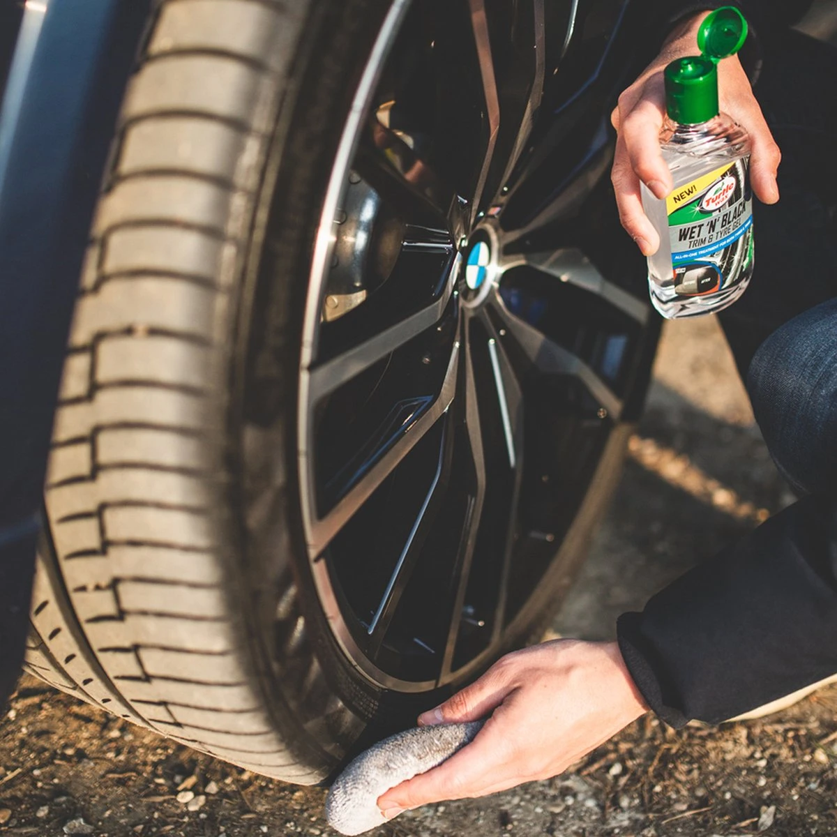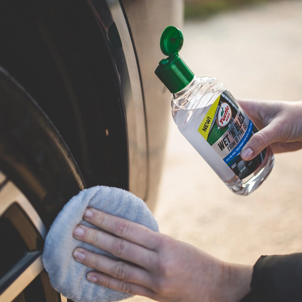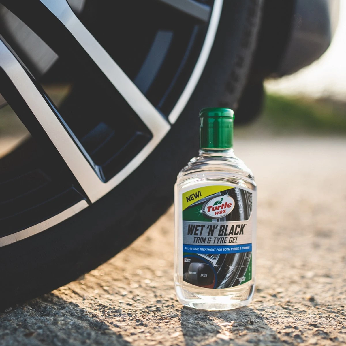 Turtle Wax Wet N Black Trim & Tyre Gel is een “All-in One” behandeling om zowel banden als vervaagde uitwendige delen te herstellen naar de oorspronkelijke zwarte kleur. Het kan ook vervaging van banden op nieuwere voertuigen voorkomen en maskeert doffe witte wasresten. Het verfraait en laat een diepe zwarte glans op rubber, kunststof gegoten bumpers, Pick-up covers, en raamrubbers.