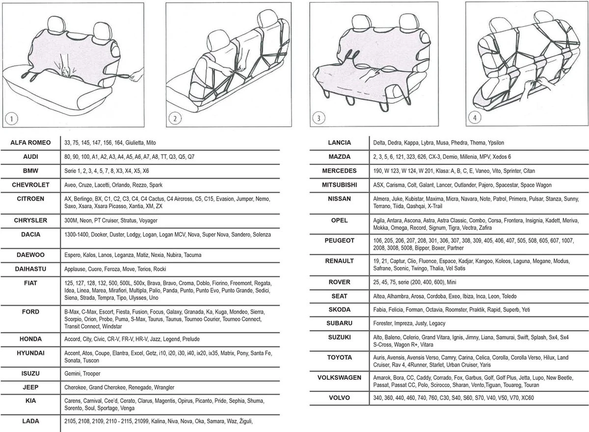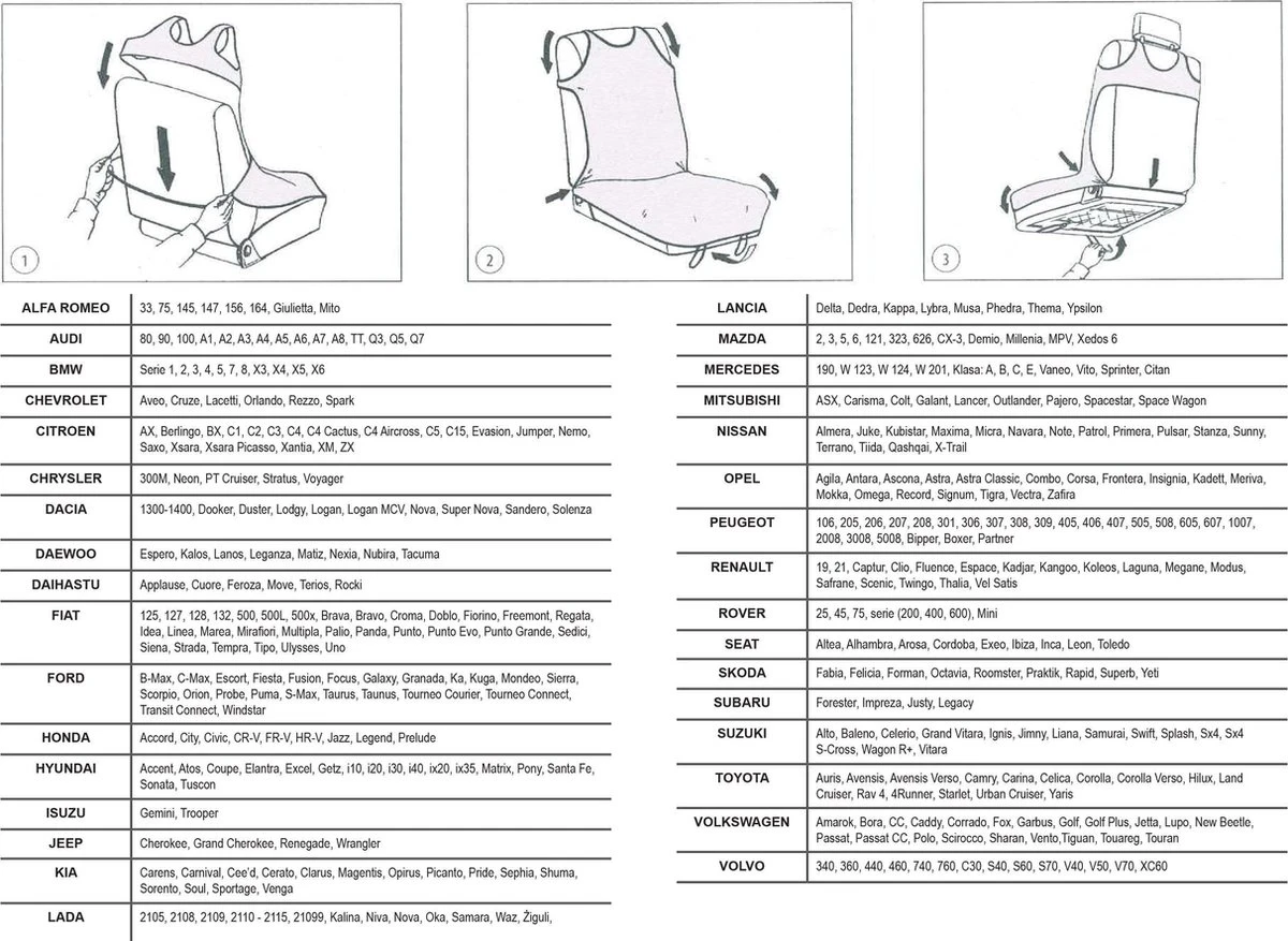 Set van 2 hoezen voor bestuurders- en passagiersstoel. Zeer gemakkelijk aan te brengen en af te nemen, voor stoelen met of zonder hoofdsteunen, compatibel met zijdelingse airbags. Erg praktisch in de zomer als je terugkomt van het strand om je stoelen te beschermen.